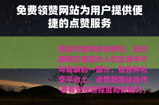 免费领赞网站的出现,为那些希望在社交平台上获得更多关注和认可的用户提供了一个新的途径,这些网站通常操作简单,用户只需在平台上注册账号,按照相应的流程进行操作,就可以轻松获得免费的点赞,无论是个人用户想要展示自己的生活点滴、兴趣爱好,还是企业用户希望推广产品和服务,领赞网站都能在一定程度上帮助他们提升在社交平台上的曝光度。