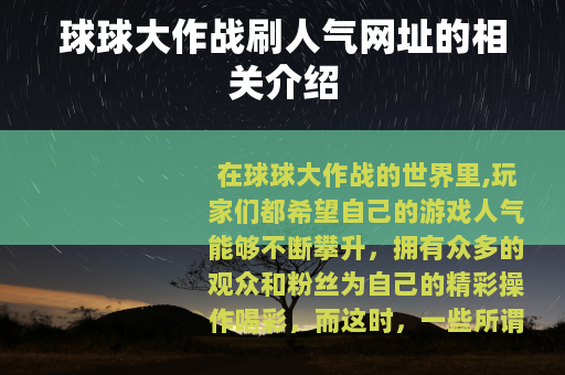 在球球大作战的世界里,玩家们都希望自己的游戏人气能够不断攀升,拥有众多的观众和粉丝为自己的精彩操作喝彩,而这时,一些所谓的球球大作战刷人气网址就进入了玩家们的视野。