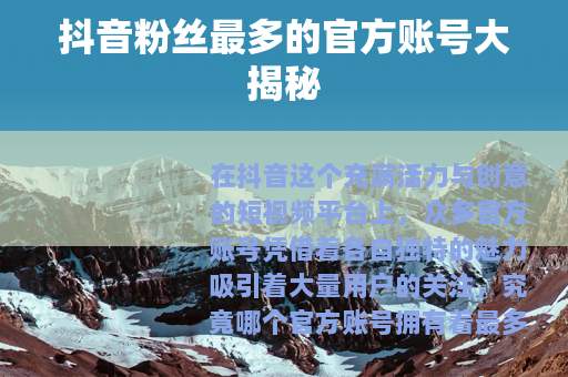 在抖音这个充满活力与创意的短视频平台上,众多官方账号凭借着各自独特的魅力吸引着大量用户的关注,究竟哪个官方账号拥有着最多的粉丝呢?这无疑是一个备受瞩目的话题。