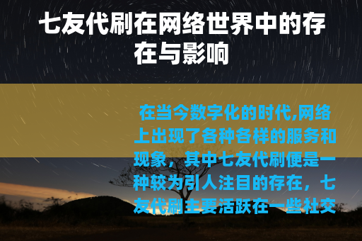 在当今数字化的时代,网络上出现了各种各样的服务和现象,其中七友代刷便是一种较为引人注目的存在,七友代刷主要活跃在一些社交媒体和网络平台的相关领域。