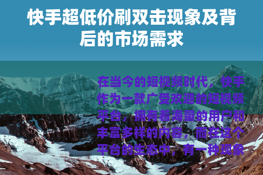在当今的短视频时代,快手作为一款广受欢迎的短视频平台,拥有着海量的用户和丰富多样的内容,而在这个平台的生态中,有一种现象引起了不少人的关注,那就是快手超低价刷双击服务的存在。