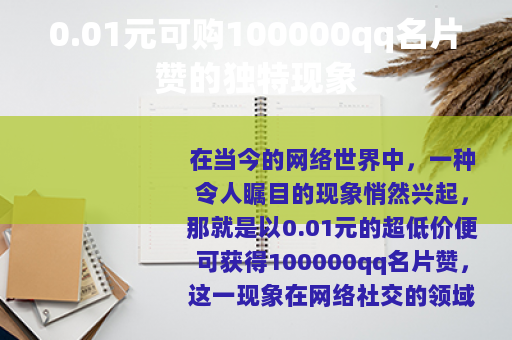 在当今的网络世界中,一种令人瞩目的现象悄然兴起,那就是以0.01元的超低价便可获得100000qq名片赞,这一现象在网络社交的领域中引发了广泛的关注和讨论,吸引了众多QQ用户的目光。