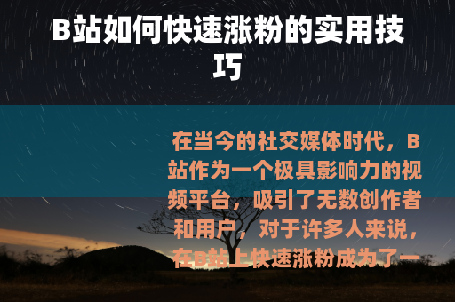 在当今的社交媒体时代,B站作为一个极具影响力的视频平台,吸引了无数创作者和用户,对于许多人来说,在B站上快速涨粉成为了一个重要的目标,究竟有哪些方法可以帮助我们在B站实现快速涨粉呢? 质量是关键,要想吸引粉丝,就必须提供有价值、有趣、独特的视频内容,深入了解自己的目标受众,明确他们的兴趣和需求,然后根据这些来创作视频,无论是搞笑、知识科普、美食制作还是游戏攻略等各种类型的视频,都要确保在内容上做到精益求精,让观众在观看后能够有所收获,并且愿意持续关注你的频道。