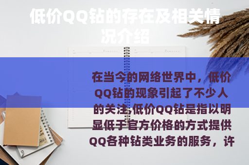 在当今的网络世界中,低价QQ钻的现象引起了不少人的关注,低价QQ钻是指以明显低于官方价格的方式提供QQ各种钻类业务的服务。