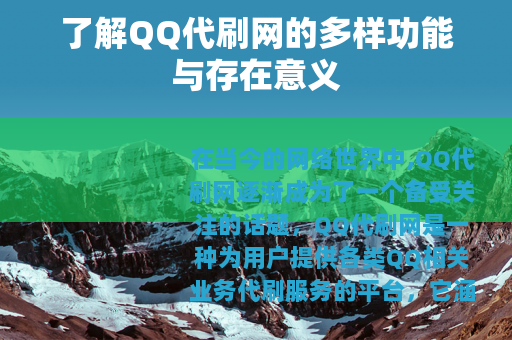 在当今的网络世界中,QQ代刷网逐渐成为了一个备受关注的话题,QQ代刷网是一种为用户提供各类QQ相关业务代刷服务的平台,它涵盖了众多方面的业务,满足了不同用户的需求。