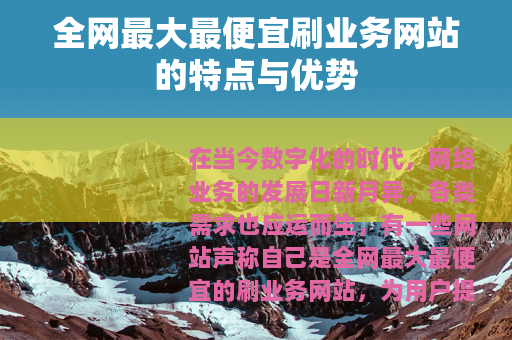 全网最大最便宜的刷业务网站在当今的网络环境中具有一定的市场需求和存在价值,它们为用户提供了丰富的业务种类、实惠的价格、高效的服务以及良好的用户体验,帮助用户在激烈的市场竞争中快速提升自己的业务数据和影响力,但用户在使用时要明确其局限性,合理利用其优势,以实现自身的发展目标。