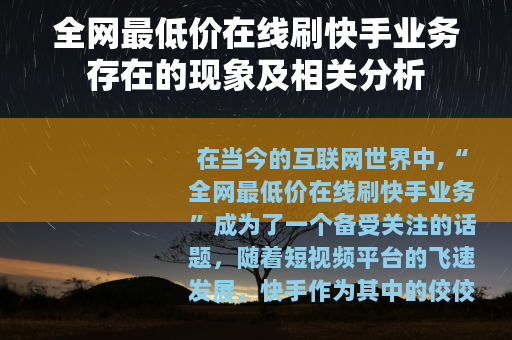 在当今的互联网世界中,“全网最低价在线刷快手业务”成为了一个备受关注的话题,随着短视频平台的飞速发展,快手作为其中的佼佼者,拥有着庞大的用户群体和极高的活跃度,而与之相关的刷业务现象也应运而生,全网最低价在线刷快手业务更是吸引了众多人的目光。