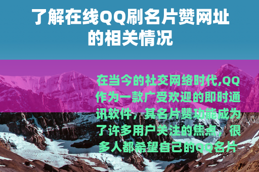 在当今的社交网络时代,QQ作为一款广受欢迎的即时通讯软件,其名片赞功能成为了许多用户关注的焦点,很多人都希望自己的QQ名片能够获得更多的赞,以展示自己的人气和社交魅力,而在线QQ刷名片赞网址也随之应运而生,为用户提供了一种快速增加名片赞数量的途径。