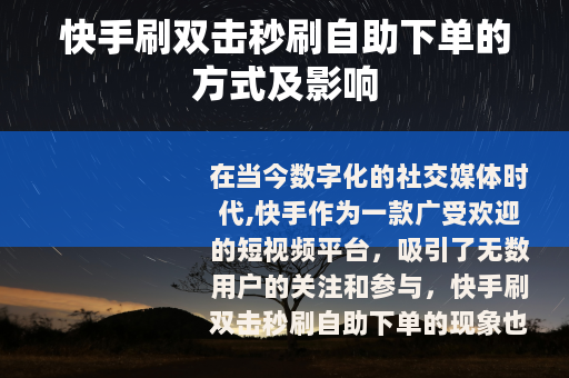 在当今数字化的社交媒体时代,快手作为一款广受欢迎的短视频平台,吸引了无数用户的关注和参与,快手刷双击秒刷自助下单的现象也逐渐兴起,成为了一个值得探讨的话题。