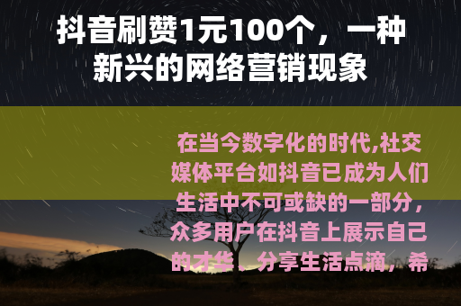 在当今数字化的时代,社交媒体平台如抖音已成为人们生活中不可或缺的一部分,众多用户在抖音上展示自己的才华、分享生活点滴,希望能获得更多的关注和点赞,而在这个过程中,出现了一种现象,那就是抖音刷赞1元100个的服务。