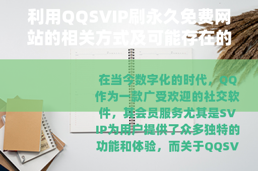 在当今数字化的时代,QQ作为一款广受欢迎的社交软件,其会员服务尤其是SVIP为用户提供了众多独特的功能和体验,而关于QQSVIP刷永久免费网站的话题,也在一些网络角落引起了不少人的关注。