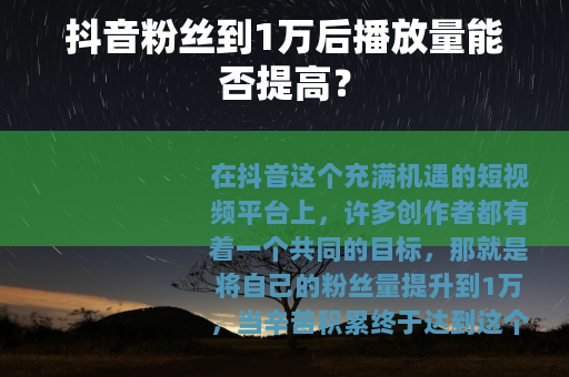 在抖音这个充满机遇的短视频平台上,许多创作者都有着一个共同的目标,那就是将自己的粉丝量提升到1万,当辛苦积累终于达到这个数字后,大家往往会关心一个关键问题:粉丝到1万后,播放量能提高吗?