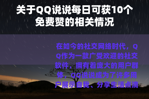 这每日10个免费赞的设定也体现了QQ对用户社交体验的重视,它为用户提供了一种简单而直接的方式来表达自己对他人的喜爱和关注,丰富了QQ说说的互动形式,与评论、转发等功能相结合,让QQ空间的社交氛围更加活跃和多元化。