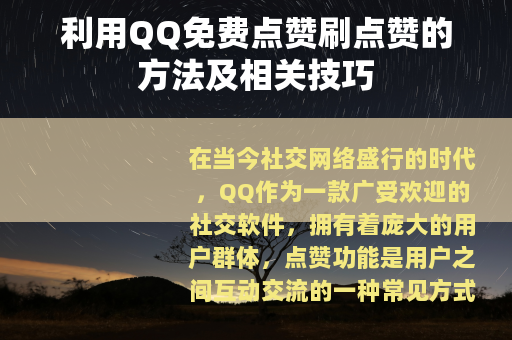 在利用QQ免费点赞刷点赞的过程中,我们要不断探索和尝试新的方法和技巧,根据自己的实际情况和社交需求,找到最适合自己的方式,但无论采用何种方式,都要始终牢记社交的初心是为了与他人建立良好的关系,分享快乐和知识,而点赞只是其中的一个小小环节,只有在保持真诚、积极、有趣的社交态度的基础上,通过不断努力和创新,才能在QQ社交中实现点赞数量与社交质量的双丰收,让我们的QQ社交生活更加精彩和有意义。