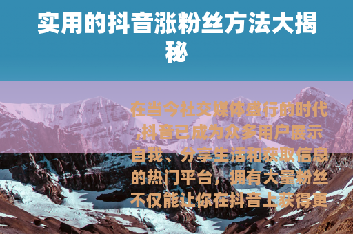在当今社交媒体盛行的时代,抖音已成为众多用户展示自我、分享生活和获取信息的热门平台,拥有大量粉丝不仅能让你在抖音上获得更多的关注和认可,还可能为你带来各种商业机会和收益,如何在抖音上有效地涨粉丝呢?下面就为大家介绍一些实用的方法。