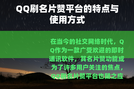 在当今的社交网络时代,QQ作为一款广受欢迎的即时通讯软件,其名片赞功能成为了许多用户关注的焦点,QQ刷名片赞平台也随之应运而生,为用户提供了一种快速增加名片赞数量的途径。