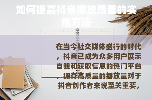 在当今社交媒体盛行的时代,抖音已成为众多用户展示自我和获取信息的热门平台,拥有高质量的播放量对于抖音创作者来说至关重要,它不仅能增加账号的曝光度,还能吸引更多的粉丝关注,怎么提高抖音播放质量呢?以下是一些实用的方法。 是关键,要确保你的视频内容具有吸引力和独特性,深入了解你的目标受众,知道他们感兴趣的话题和痛点,从而创作出能够引起他们共鸣的视频,可以是有趣的搞笑段子、实用的生活小妙招、感人的故事或者是专业的知识分享等,通过提供有价值的内容,让观众在观看后能有所收获,这样他们就更有可能点赞、评论和分享你的视频,进而提高播放质量。