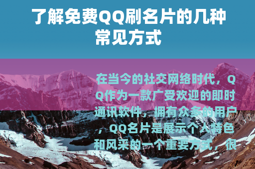 免费QQ刷名片为我们提供了一个提升自己QQ名片人气的机会,让我们可以在社交网络中展现出更好的自己,我们要善于利用这些机会,通过合理合法的方式,让自己的QQ名片变得更加精彩,吸引更多人的关注和喜爱,在这个过程中,不断探索和尝试新的方法,不断提升自己的社交能力和影响力,让QQ成为我们更加丰富多彩的社交舞台。 仅供参考,QQ刷名片等类似行为可能会违反QQ平台的使用规范和相关规定,具体请以QQ官方规定为准。
