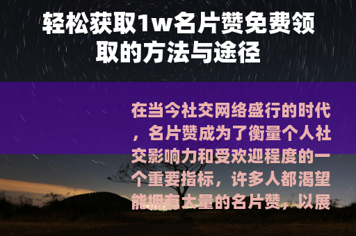 免费领取1w名片赞并不是一件遥不可及的事情,只要我们积极参与各种社交活动,善于利用各种平台和工具,就有机会实现这个目标,拥有大量的名片赞不仅可以让我们在社交网络中获得更多的关注和认可,还能为我们带来更多的社交机会和乐趣,大家不妨行动起来,去寻找属于自己的免费名片赞领取途径,让自己的社交生活更加精彩。