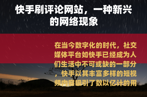 快手刷评论网站是一种在社交媒体发展过程中出现的新兴现象,它既反映了用户对作品热度和关注的追求,也暴露了平台在管理和运营方面存在的一些问题,在未来,随着社交媒体技术的不断发展和用户意识的提高,我们相信快手平台和用户将共同努力,找到一种更加合理和有效的方式来平衡作品热度与真实互动之间的关系,让快手平台能够更加健康、有序地发展。