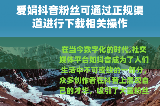 爱娟的抖音粉丝下载相关操作是一个积极且充满乐趣的过程,它为粉丝们提供了一个与自己喜爱的创作者紧密联系的机会,也为爱娟的发展提供了强大的动力支持,只要大家遵循正规的渠道和规则,就能在这个过程中收获满满的快乐和感动,共同见证爱娟在抖音世界中的不断成长和成功。