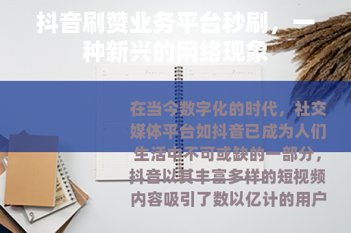 在当今数字化的时代,社交媒体平台如抖音已成为人们生活中不可或缺的一部分,抖音以其丰富多样的短视频内容吸引了数以亿计的用户,在这个庞大的用户群体中,一种名为抖音刷赞业务平台秒刷的现象逐渐兴起。