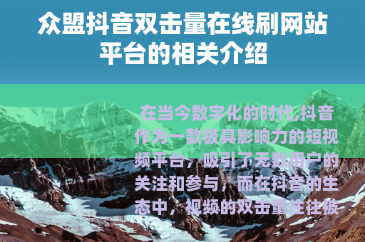 在当今数字化的时代,抖音作为一款极具影响力的短视频平台,吸引了无数用户的关注和参与,而在抖音的生态中,视频的双击量往往被视为衡量其受欢迎程度的重要指标之一,众盟抖音双击量在线刷网站平台也在这样的背景下应运而生。