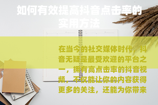 通过以上这些方法的综合运用,相信你能够有效地提高抖音视频的点击率,让你的抖音账号在众多用户中脱颖而出,获得更多的关注和喜爱,不断尝试和优化,根据用户的反馈及时调整自己的策略,才能在抖音这个充满竞争的平台上取得更好的成绩。