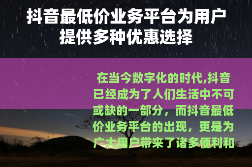 在当今数字化的时代,抖音已经成为了人们生活中不可或缺的一部分,而抖音最低价业务平台的出现,更是为广大用户带来了诸多便利和惊喜。