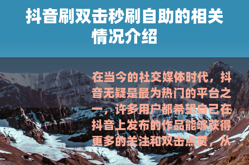 在当今的社交媒体时代,抖音无疑是最为热门的平台之一,许多用户都希望自己在抖音上发布的作品能够获得更多的关注和双击点赞,从而提升自己的人气和影响力,而抖音刷双击秒刷自助这一服务也随之应运而生。
