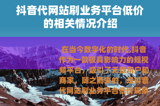 在当今数字化的时代,抖音作为一款极具影响力的短视频平台,吸引了无数用户和商家,随之而来的,是抖音代网站刷业务平台低价现象的出现。