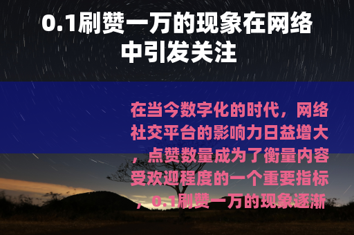 在当今数字化的时代,网络社交平台的影响力日益增大,点赞数量成为了衡量内容受欢迎程度的一个重要指标,0.1刷赞一万的现象逐渐进入了人们的视野。