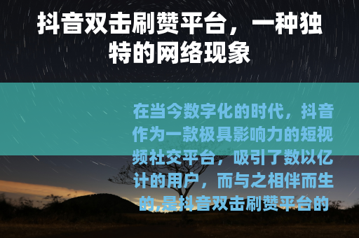 在当今数字化的时代,抖音作为一款极具影响力的短视频社交平台,吸引了数以亿计的用户,而与之相伴而生的,是抖音双击刷赞平台的悄然兴起。