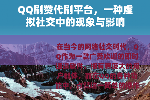 在互联网时代,QQ刷赞代刷平台的兴起是一个值得关注的现象,它在一定程度上改变了QQ社交平台上的点赞生态,对用户的社交行为和心理产生了影响。