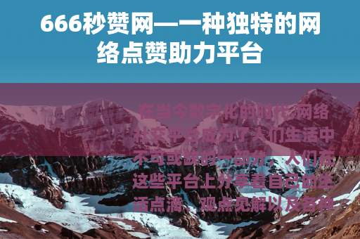 在当今数字化的时代,网络社交平台成为了人们生活中不可或缺的一部分,人们在这些平台上分享着自己的生活点滴、观点见解以及各种创意作品,渴望得到他人的关注和认可,而点赞,作为一种最直接的反馈方式,无疑承载着重要的意义,在这样的背景下,666秒赞网应运而生,为众多用户提供了一个独特的点赞助力平台。