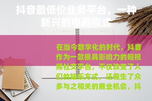 在当今数字化的时代,抖音作为一款极具影响力的短视频社交平台,不仅改变了人们的娱乐方式,还催生了众多与之相关的商业机会,抖音最低价业务平台逐渐崭露头角,成为了众多商家和消费者关注的焦点。