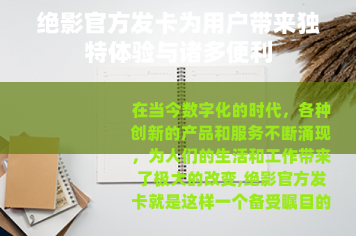 在当今数字化的时代,各种创新的产品和服务不断涌现,为人们的生活和工作带来了极大的改变,绝影官方发卡就是这样一个备受瞩目的存在。