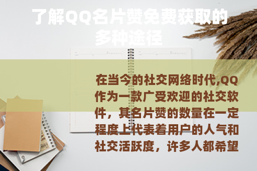 在当今的社交网络时代,QQ作为一款广受欢迎的社交软件,其名片赞的数量在一定程度上代表着用户的人气和社交活跃度,许多人都希望能够增加自己QQ名片的点赞数,而免费获取QQ名片赞也成为了不少用户关注的焦点。