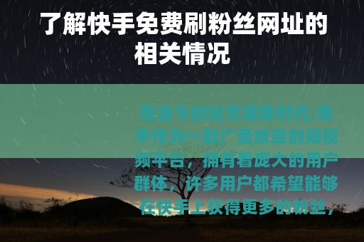 在当今的社交媒体时代,快手作为一款广受欢迎的短视频平台,拥有着庞大的用户群体,许多用户都希望能够在快手上获得更多的粉丝,以增加自己作品的曝光度和影响力,在这种需求下,一些所谓的快手免费刷粉丝网址开始在网络上出现。