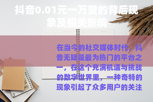 在当今的社交媒体时代,抖音无疑是最为热门的平台之一,在这个充满机遇与挑战的数字世界里,一种奇特的现象引起了众多用户的关注,那就是所谓的抖音0.01元一万赞。
