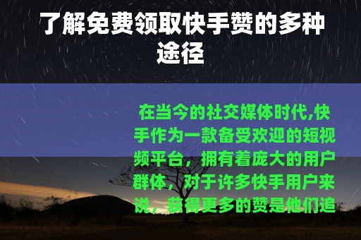 在当今的社交媒体时代,快手作为一款备受欢迎的短视频平台,拥有着庞大的用户群体,对于许多快手用户来说,获得更多的赞是他们追求的目标之一,因为赞的数量在一定程度上代表着作品的受欢迎程度和影响力,而免费领取快手赞也成为了一个热门话题,下面就来详细了解一下相关的途径和方法。