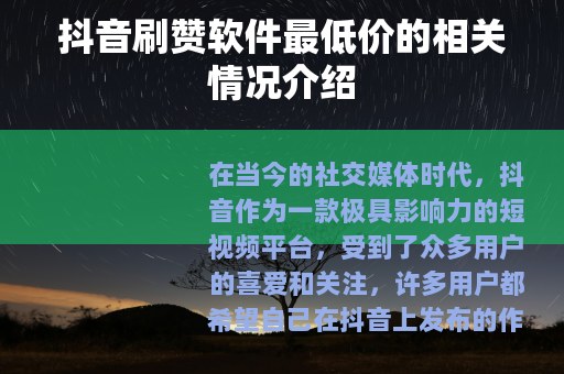 在当今的社交媒体时代,抖音作为一款极具影响力的短视频平台,受到了众多用户的喜爱和关注,许多用户都希望自己在抖音上发布的作品能够获得更多的点赞,从而提高作品的热度和曝光度,在这样的需求下,市场上出现了各种各样声称能提供抖音刷赞服务的软件,其中不乏一些打着最低价旗号的产品。