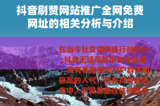 在当今社交媒体盛行的时代,抖音无疑是其中的佼佼者,拥有着海量的用户群体和极高的人气,而在抖音的生态中,点赞数量往往被视为衡量一个视频受欢迎程度的重要指标之一,抖音刷赞网站推广全网免费网址这样的信息开始在网络上出现并受到一些人的关注。