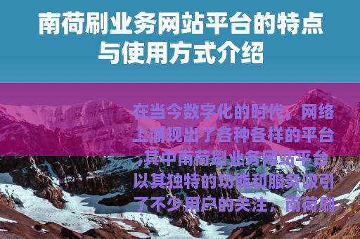 在当今数字化的时代,网络上涌现出了各种各样的平台,其中南荷刷业务网站平台以其独特的功能和服务吸引了不少用户的关注。