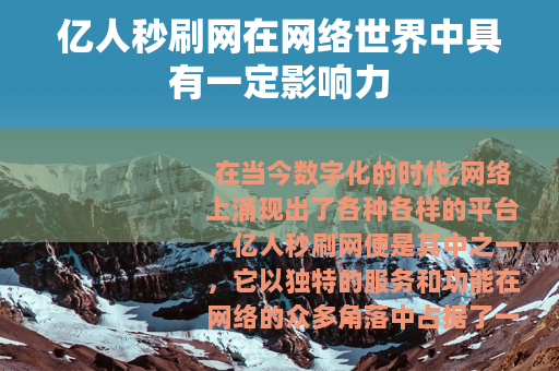 在当今数字化的时代,网络上涌现出了各种各样的平台,亿人秒刷网便是其中之一,它以独特的服务和功能在网络的众多角落中占据了一席之地。