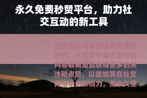 在当今数字化的时代,社交媒体已经成为人们生活中不可或缺的一部分,人们通过各种社交媒体平台分享自己的生活点滴、观点和创意,与朋友、家人和陌生人进行交流和互动,而在这个信息爆炸的时代,要让自己的声音被更多人听到,就需要采取一些有效的方法来提高自己的曝光度,永久免费秒赞平台的出现,正好满足了这一需求。