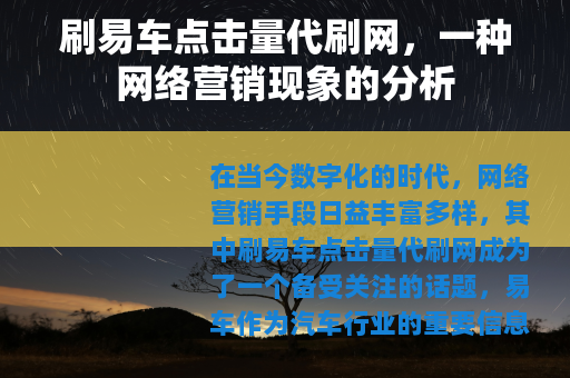 在当今数字化的时代,网络营销手段日益丰富多样,其中刷易车点击量代刷网成为了一个备受关注的话题,易车作为汽车行业的重要信息平台,其点击量在一定程度上反映了车辆信息的受关注程度以及相关内容的热度,而刷易车点击量代刷网的出现,正是基于部分商家或个人希望通过提高点击量来提升在易车平台上的曝光度和影响力。
