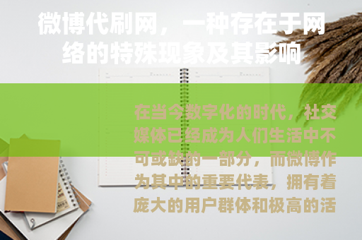 在当今数字化的时代,社交媒体已经成为人们生活中不可或缺的一部分,而微博作为其中的重要代表,拥有着庞大的用户群体和极高的活跃度,在微博的生态环境中,出现了一种名为微博代刷网的现象,它在一定程度上影响着微博平台的运营和用户的体验。