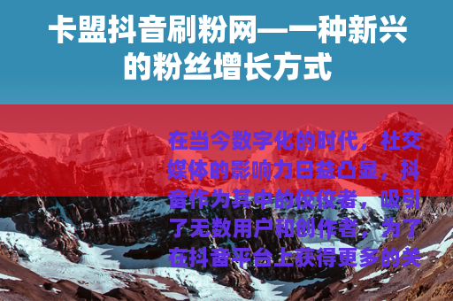 在当今数字化的时代,社交媒体的影响力日益凸显,抖音作为其中的佼佼者,吸引了无数用户和创作者,为了在抖音平台上获得更多的关注和流量,许多人都在不断探索各种方法来增加自己的粉丝数量,而卡盟抖音刷粉网就在这样的背景下应运而生。