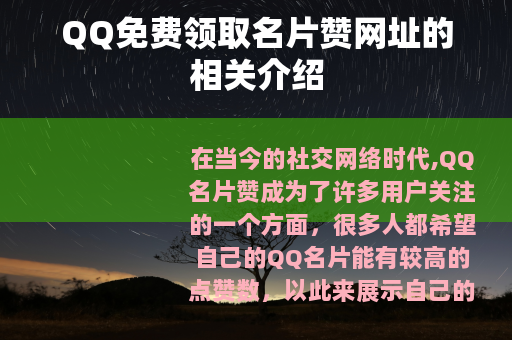 QQ免费领取名片赞网址为广大QQ用户提供了一种增加名片赞数量的途径,它们在满足用户需求的同时,也为网站运营者和商家带来了一定的利益,用户在使用这些网址时要谨慎选择,合理使用,以确保自己的账号安全和良好的社交体验,才能在享受免费领取名片赞带来的便利的同时,避免不必要的麻烦和风险,让自己的QQ社交生活更加丰富多彩。